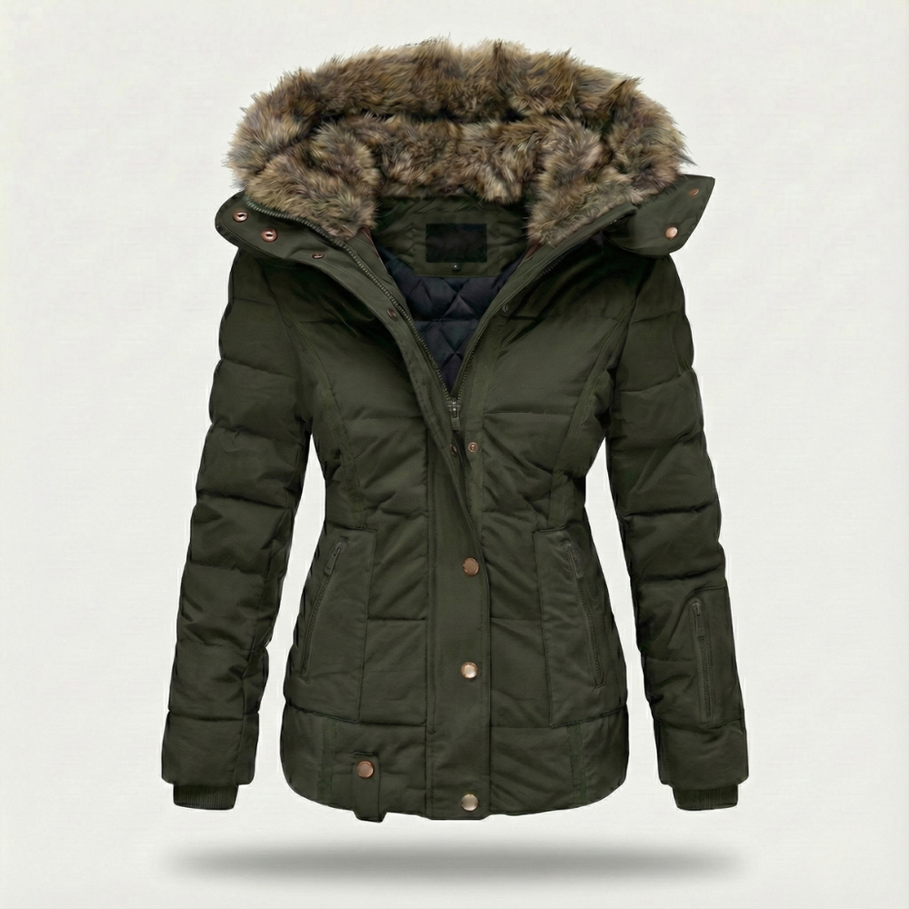 Hooded Puffer Jacket with Shaped Waist and Zip Front for Women